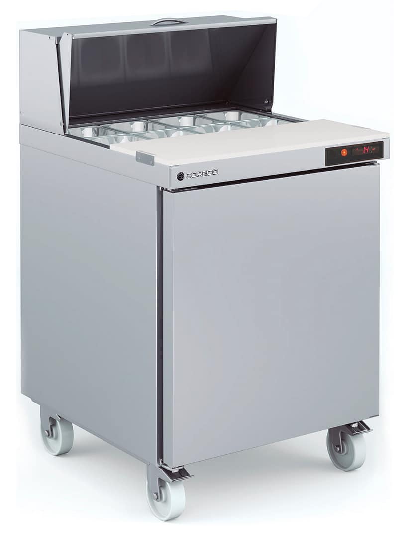La Mesa de Preparacion Refrigerada marca CORECO presenta un exterior resistente de acero inoxidable AISI-304, mientras que su interior está diseñado con aristas curvas y también de acero inoxidable AISI-304. Cuenta con puertas reversibles de doble bisagra y cierre automático, junto con un burlete magnético. La encimera de acero inoxidable AISI-304 tiene una tabla de polietileno desmontable de color blanco, ideal para la preparación de alimentos. Además, cuenta con estantes interiores ajustables en altura y capacidad para cubetas GN. Su cubierta aislada es abatible sobre el alojamiento de las cubetas. Incluye ruedas, dos con freno y dos sin freno, para mayor movilidad.